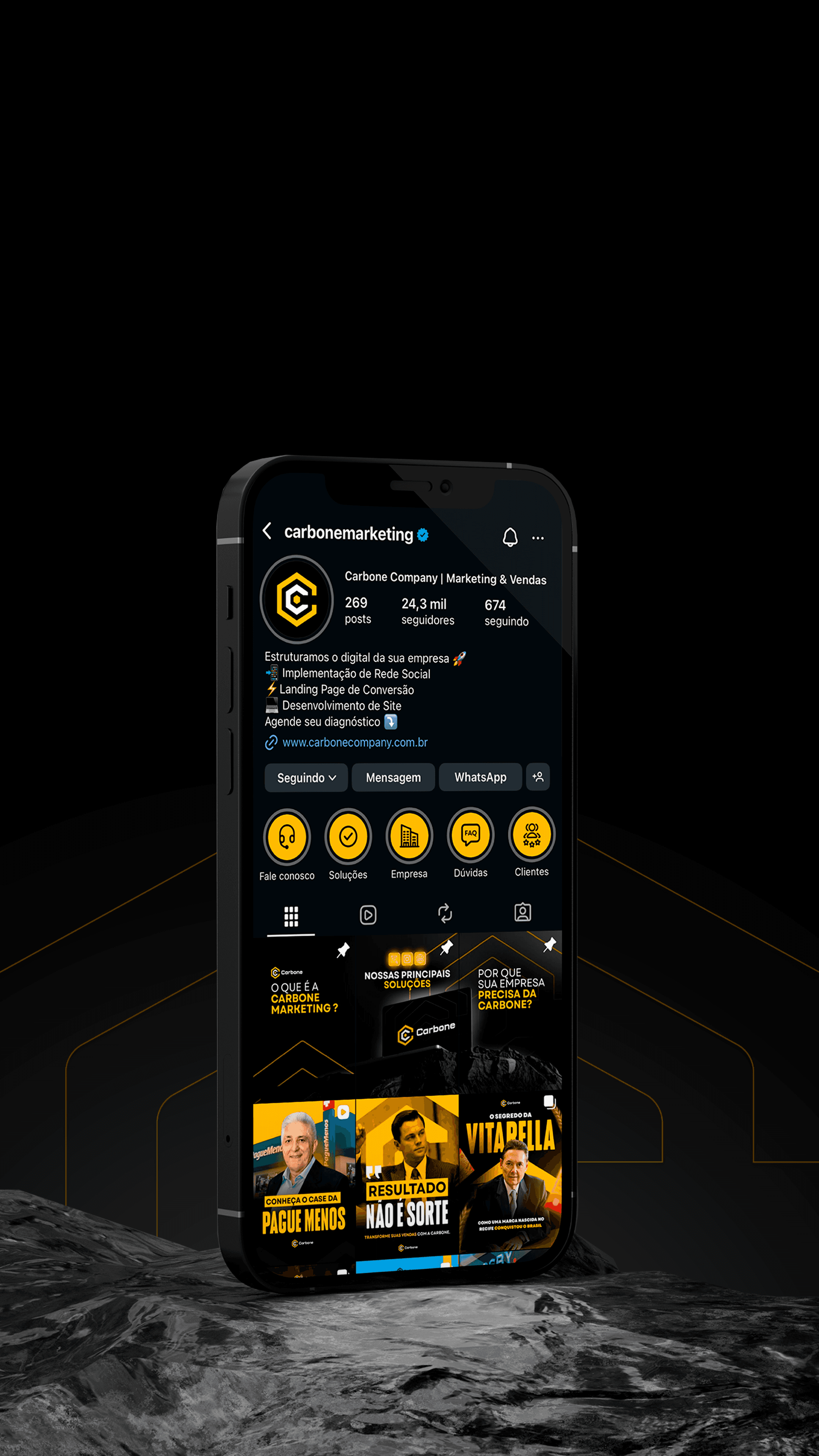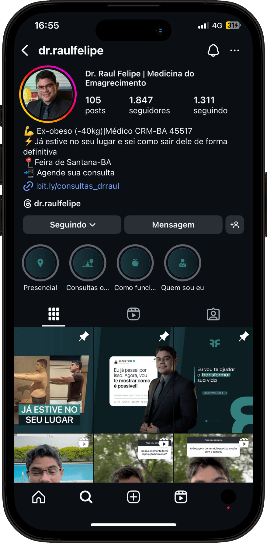 Você recebe uma bio otimizada, destaques personalizados, posts fixados estratégicos, roteiros e legendas prontos — tudo pensado pra posicionar sua marca e gerar vendas. É uma estruturação completa pra transformar seu perfil em uma vitrine profissional.